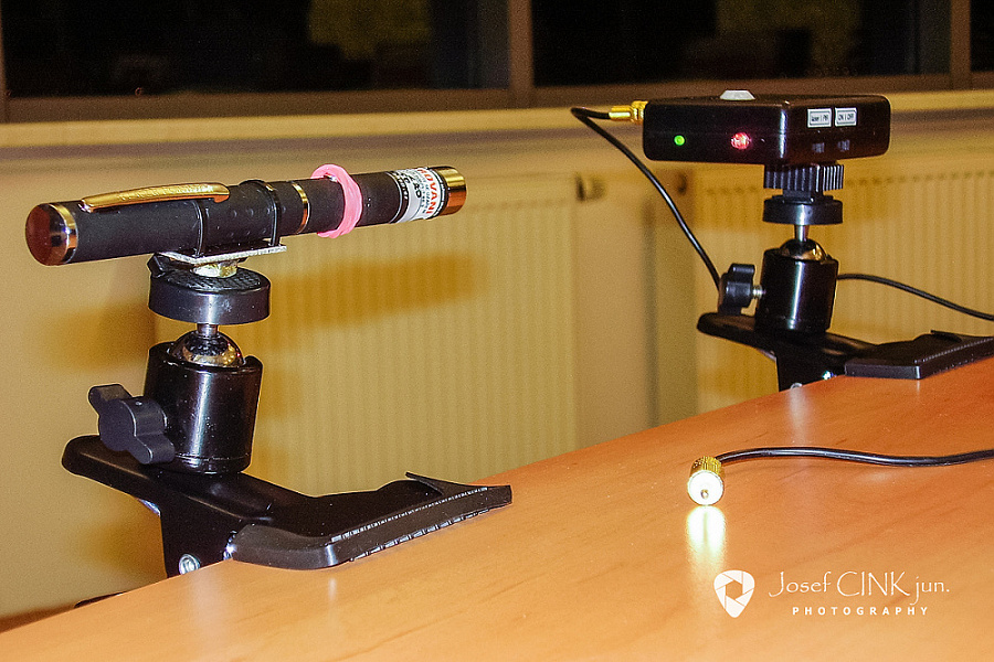 Režim 1) – laserová spoušť. K tomuto režimu budeme potřebovat laserové ukazovátko, které připevníme do místa A tak, aby paprsek dopadal na fotosnímač přijímače v místě B a paprsek laserové “závory“ současně protínal místo, kde očekáváme fotografovaný Wildlife objekt. Správné nastavení pozice vysílač <–> přijímač indikuje rozsvícená LED dioda na fotospoušti. V okamžiku, kdy fotografovaný objekt protne paprsek svým pohybem, dojde k jeho odfocení a to bez jakékoliv časové prodlevy (oproti většině komerčních spouští). Dosah laserové spouště je za denního světla až 15 m, za tmy i více jak 100 m.